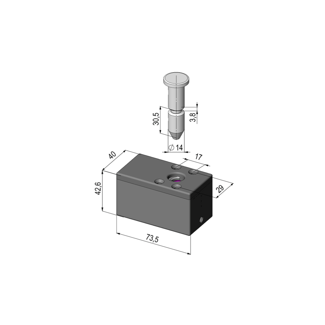 Rozměry 74 x 40 x 43 mm, vnitnří materiál: nerez, ocel, hliník, měď a železo, vnější materiál: polyamid. Selenoid 12 Vdc / 230 mA. 2 mikrospínače pro hlášení stavů "Zasunutý kolík" a "Uzamčená západka".